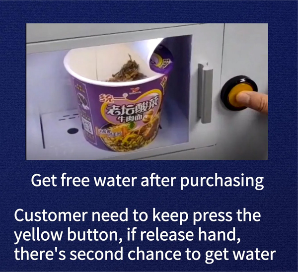 Our cup noodle vending machine with free hot-water supply after purchase, with 21.5 inch touch screen, 6 floors and 9 slots, with refrigeration 3-20℃ (adjustable), with 4G/WIFI module.