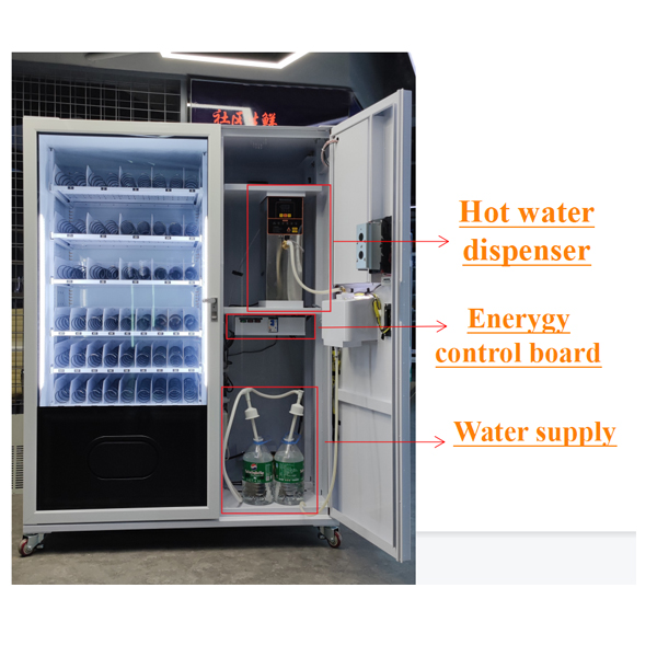 Our cup noodle vending machine with free hot-water supply after purchase, with 21.5 inch touch screen, 6 floors and 9 slots, with refrigeration 3-20℃ (adjustable), with 4G/WIFI module.